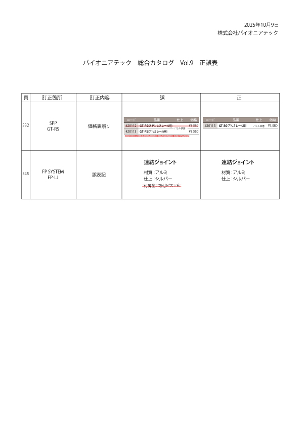 現在発刊中の総合カタログVol.9に一部誤りがございました。